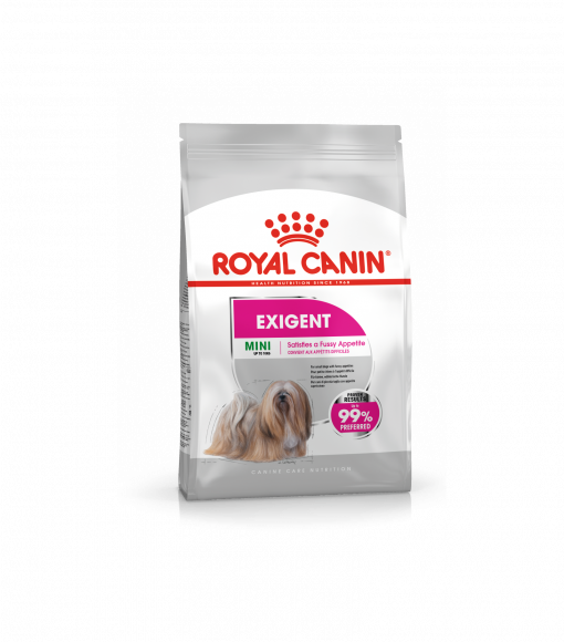 Royal Canin Mini Exigent – sausas šunų maistas mažų veislių (iki 10 kg) labai išrankiems suaugusiems šunims nuo 10 mėn. iki 8 metų amžiaus. Sukurtos specialios granulės, patinkančios išrankiems šunims. Ypatinga maisto sudėtis išlaiko gražų kailį. Jums daugiau nebereikės sukti galvos, kaip įtikti šuns išrankiam skoniui.